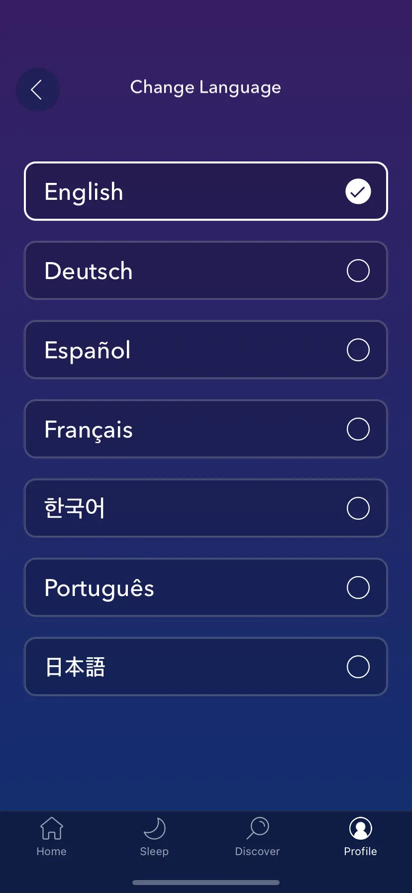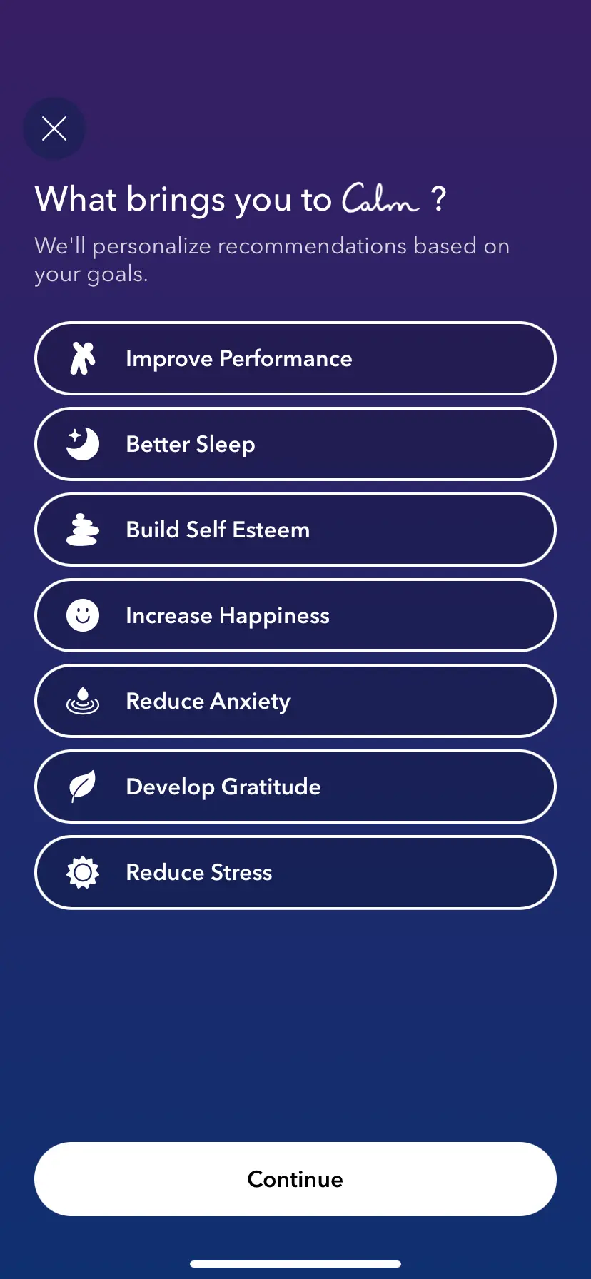로그인 후, Calm은 설정을 개인화할 수 있도록 몇 가지 질문을 합니다. 현재 느끼는 감정, 명상 경험 수준, 가장 개선하고 싶은 영역(예: 스트레스, 수면, 집중력 등)을 선택하면 Calm이 이에 맞춰 개인화된 콘텐츠를 추천해줍니다. 이를 통해 가장 적합한 프로그램을 쉽게 찾을 수 있습니다.