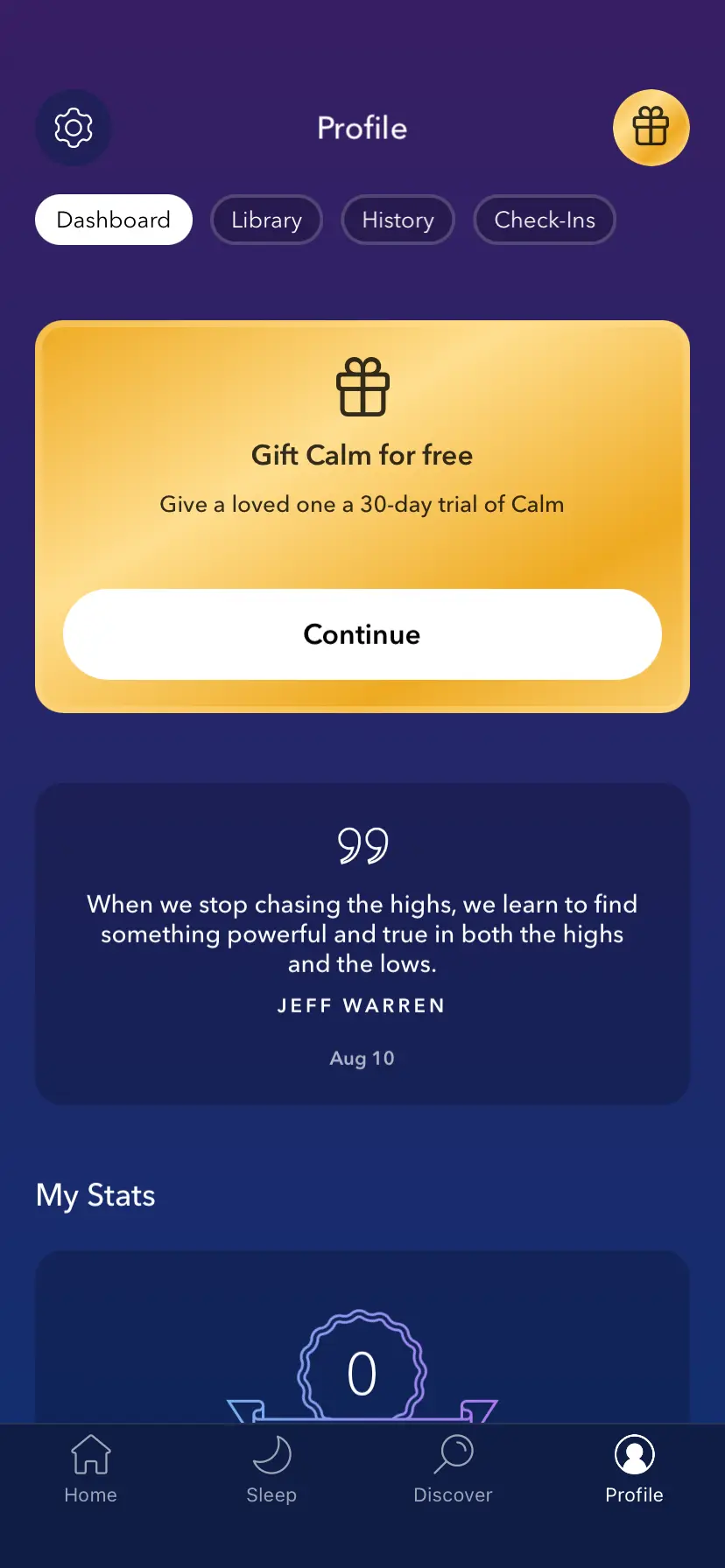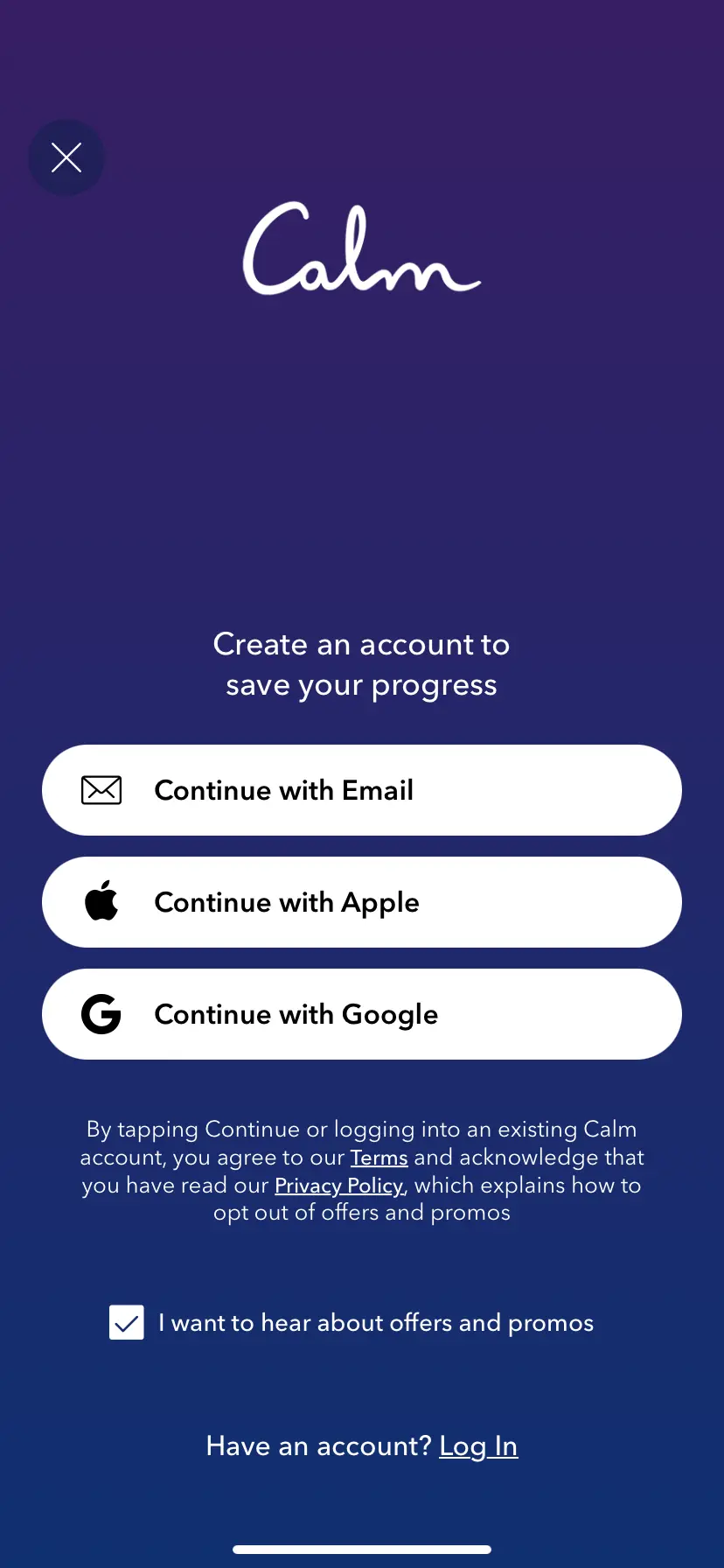 앱을 처음 실행하면, Calm은 개인화된 경험을 위해 계정 생성을 요청합니다. 이메일 주소를 사용하여 새 계정을 생성하거나 Google 또는 Facebook 계정으로 간편하게 로그인할 수 있습니다. 계정을 생성하면 Calm의 기본 기능을 모두 사용할 수 있습니다.