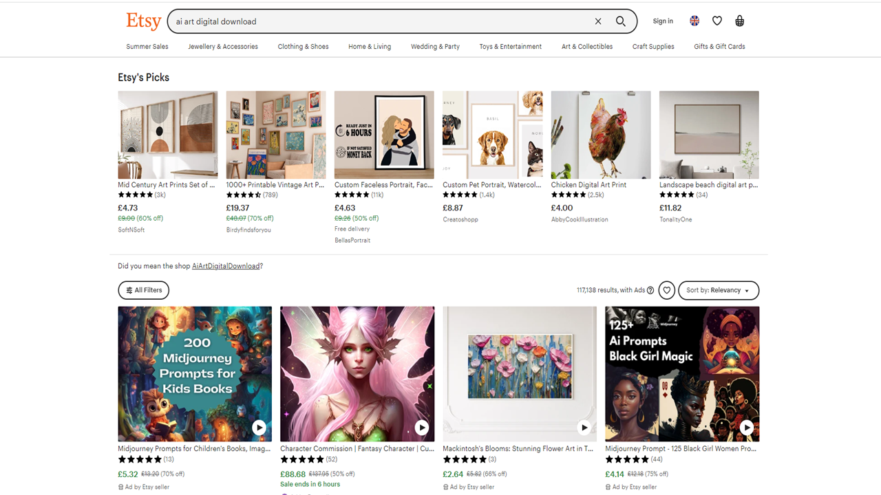 Etsy는 수제품을 판매하는 마켓플레이스로 잘 알려져 있지만, 최근에는 Notion 템플릿, AI 프롬프트와 같은 디지털 상품을 판매하는 인기 마켓플레이스가 되었습니다.