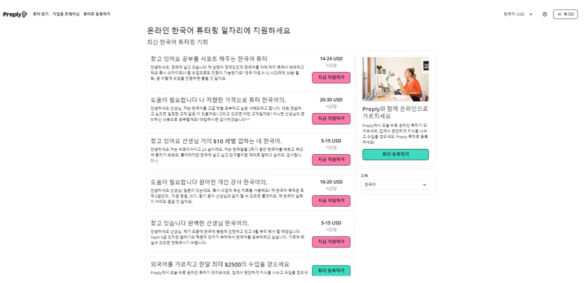 오늘 Preply에 가입하고 한국어 튜터로서의 새로운 부업을 시작해보세요. Preply에서 전 세계에 한국어를 배우고 싶은 사람들에게 한국어를 가르치는 기회를 만들어 보세요. 실행하지 않으면 아무일도 일어나지 않는다는 것을 기억하세요. 저는 여러분들을 항상 응원합니다. 화이팅!